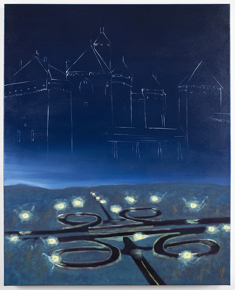 Cosmic Castle And Cloverleaf Interchange. Oil and Acrylic on Canvas. 30x24 in. 2022